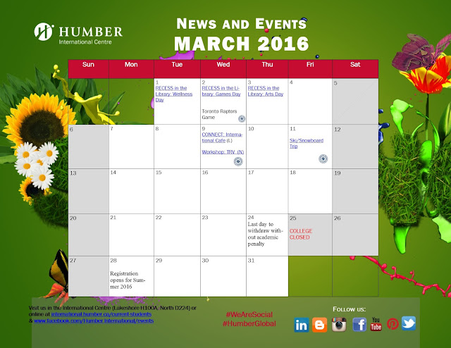 The Humber International Centre has a number of events planned for students, staff and alumni in March. Please join us! Feel free to contact the International Centre at North or Lakeshore Campus for more information.